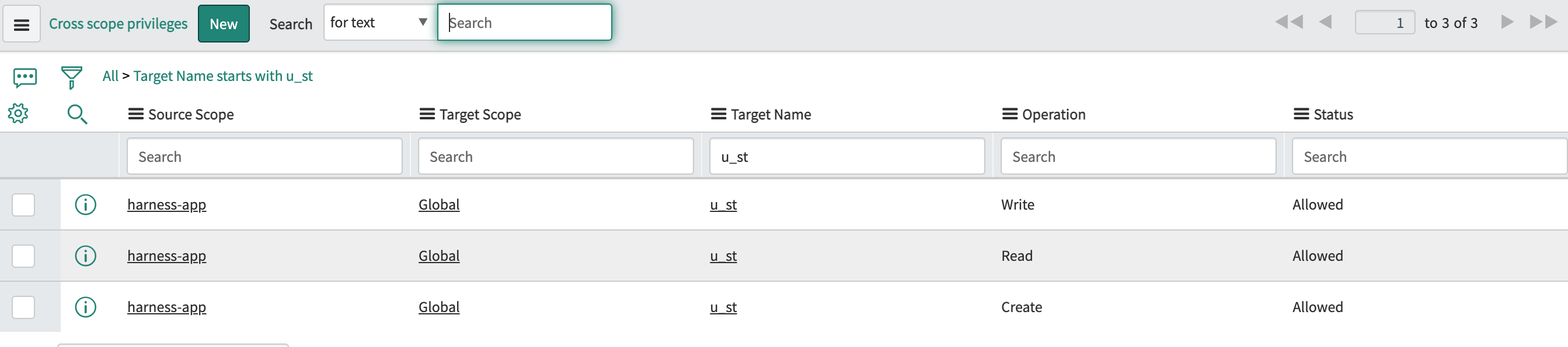 Add three (create, read, write) cross-scope privileges from the harness-app to the global scope with the target name as the table name (u_st in this example) and set the Status as Allowed.