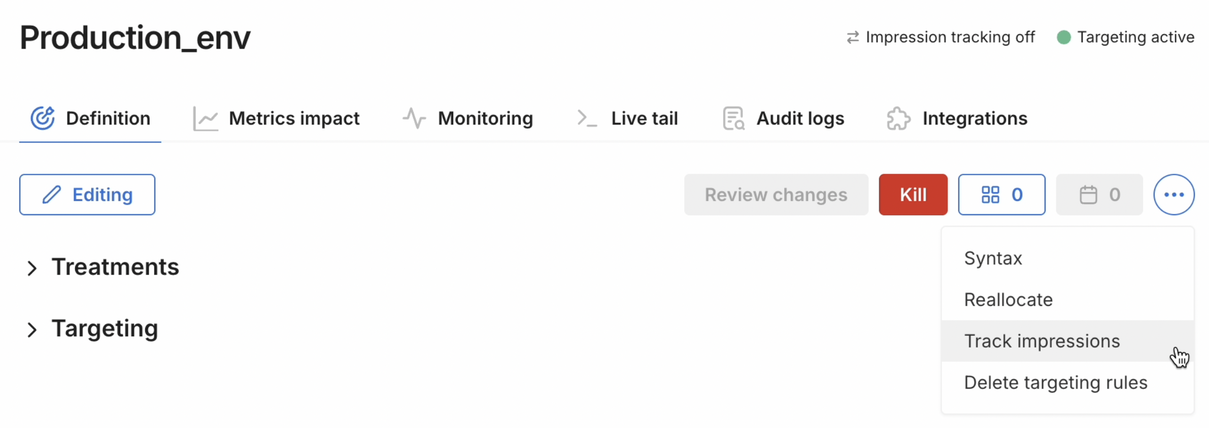Click the ellipses menu on a feature flag Definition tab, and select the Track impressions menu item.