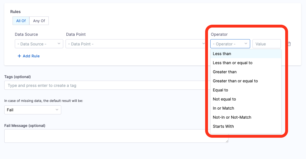 - Under Rules you can find the following Data Sources to select from.