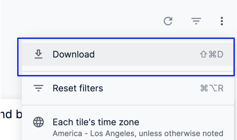 - To download the entire dashboard, select Download from the dashboard’s three-dot menu.
