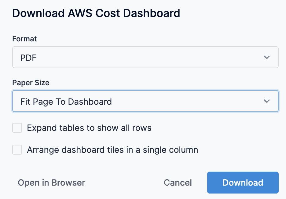 In Download AWS Cost Dashboard, in Format, select PDF.