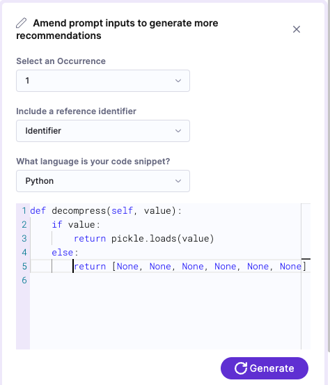 1. Add any additional context in the text pane. For example, you might want to include relevant code immediately before the snippet where the vulnerability was identified, in addition to the snippet itself. Then select Generate.