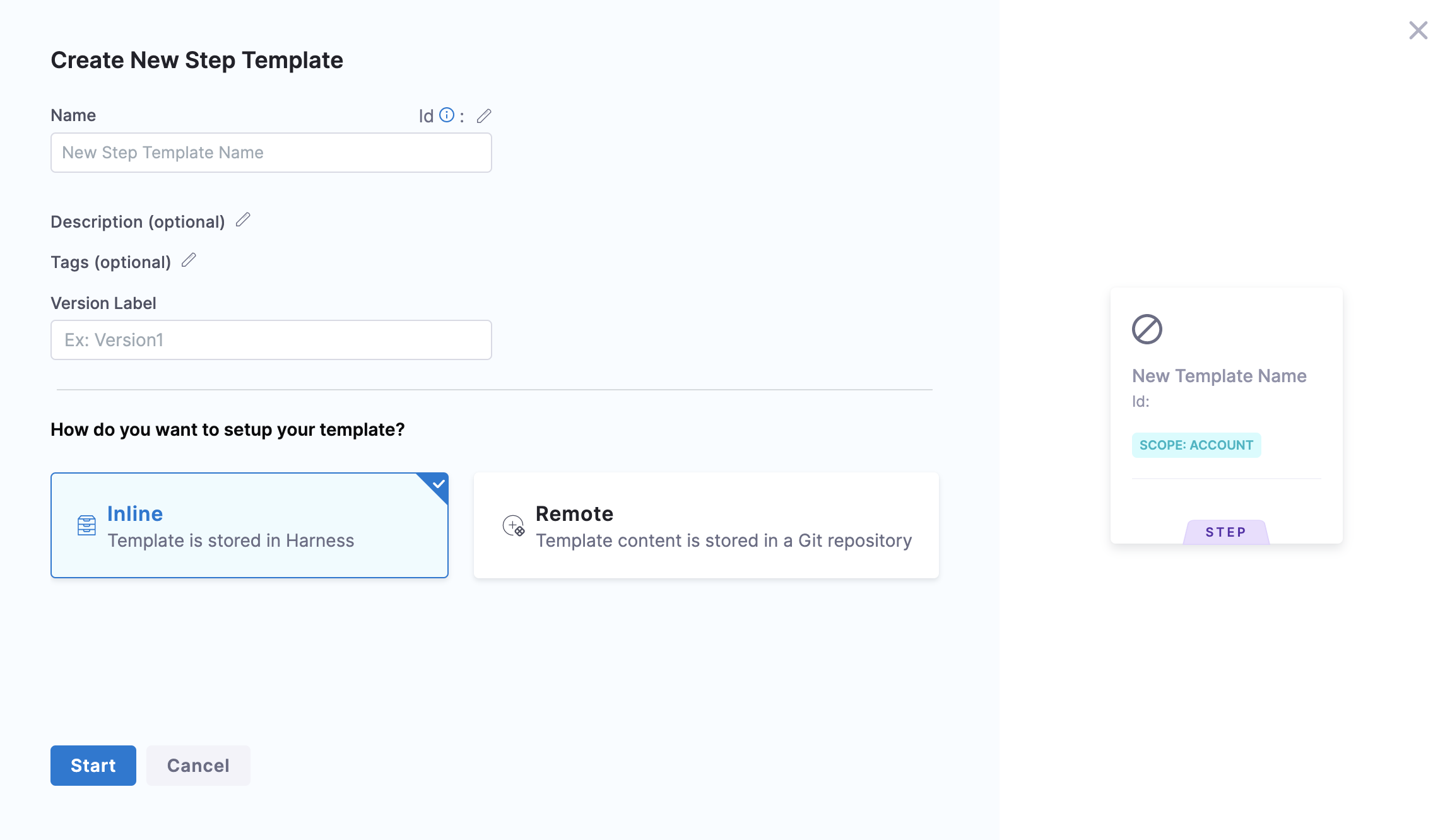 You can create a template and save it either in Harness or in a Git repository using the Inline or Remote option, respectively.