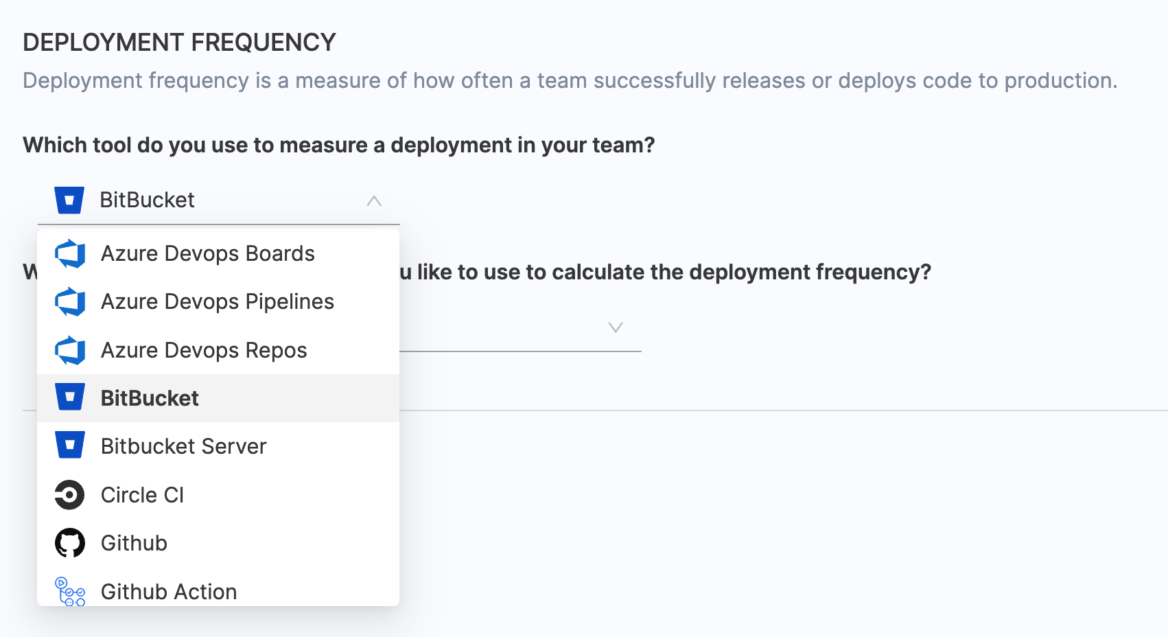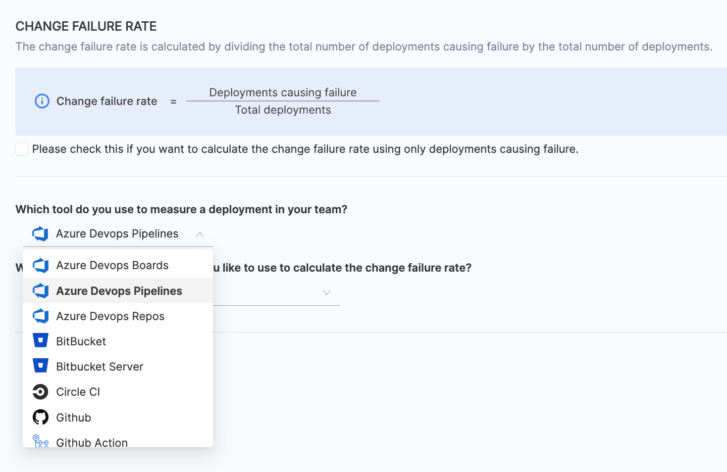 - Choose BitBucket / BitBucker Server as the tool that you use to measure change failure rate in your team.