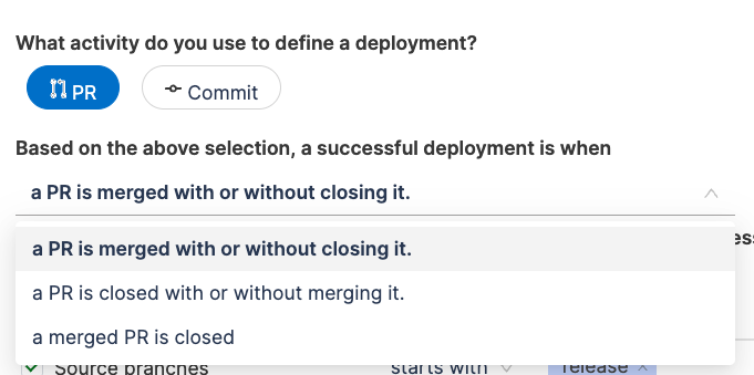 When the integration is configured with GitLab SCM, specify whether deployments causing failure and total deployments are defined based on Pull Requests (PR) or Commits.