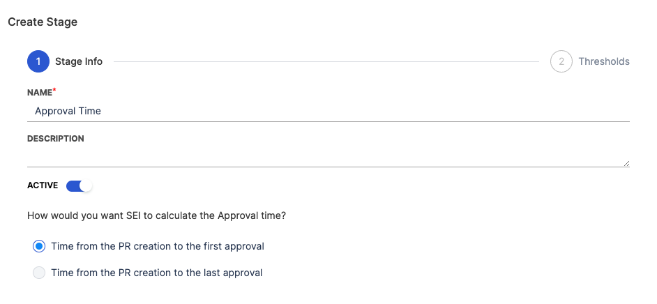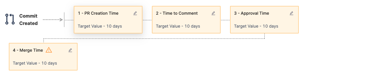 - Review the pre populated Stages that represent the PR lifecycle, from PR creation to merge. You can edit, add, and remove stages as needed. You can edit the data or fields that drive each stage, set time range goals, and more.