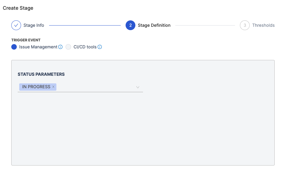 - Define the Stage Trigger Event (e.g., Issue Management) and map the stage to statuses in your issue management system.