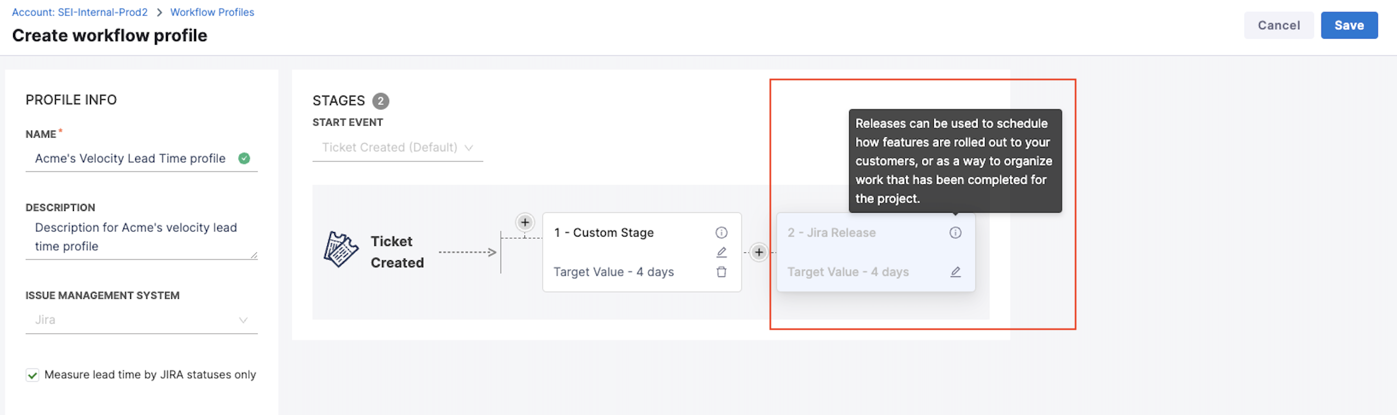 - For new profiles, the release stage is disabled by default. Enable it by selecting the checkbox to measure lead time using Jira statuses.
