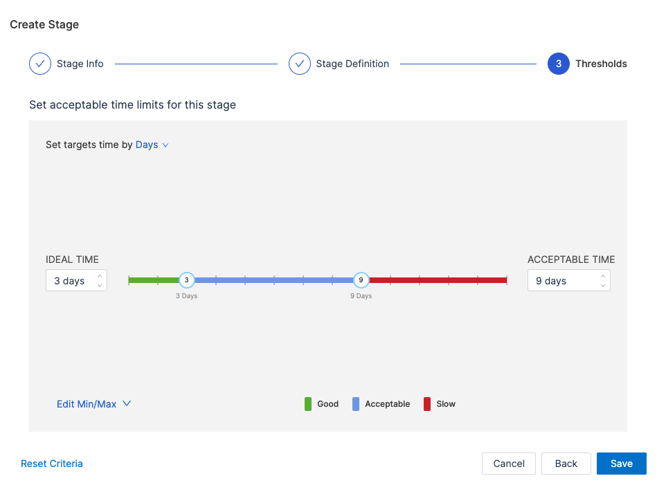 - Set acceptable time ranges for the stage, such as Ideal Time and Acceptable Time.