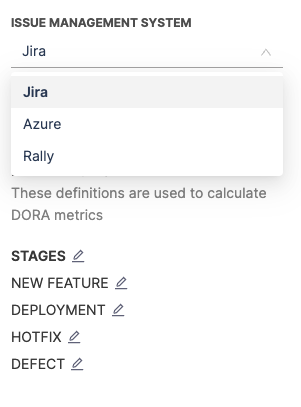- Review the pre populated Development Stages and edit them, if necessary. These stages represent the progression of code in your SCM tool, from first commit to PR merge.